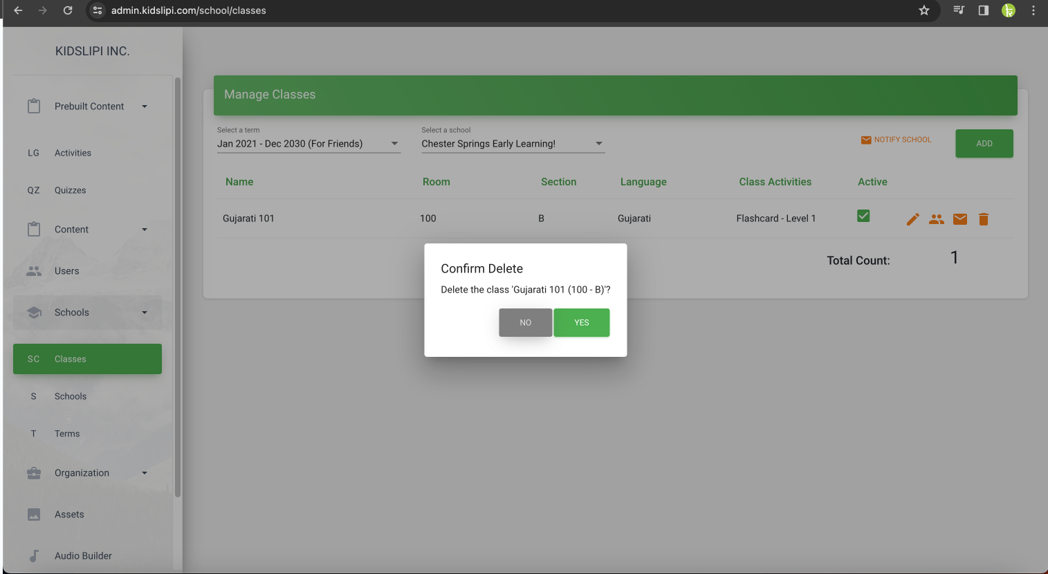 To delete a class in KidsLipi, ensure that the class does not have any students or teachers assigned to it. Follow these steps to proceed with deletion: