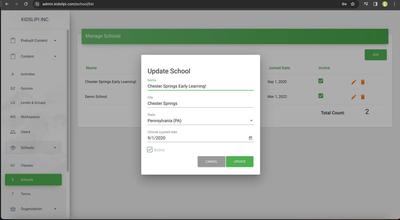 <figure><img src="https://2775373058-files.gitbook.io/~/files/v0/b/gitbook-x-prod.appspot.com/o/spaces%2Ff623a8ROiK5tAvdLpfx8%2Fuploads%2FKGzcJg5yS4sP9qr98iQV%2FScreenshot%202024-01-24%20at%2012.56.00%20PM.png?alt=media&#x26;token=2f639043-f79e-4001-8fd3-f81a3548067d" alt=""><figcaption><p>Update an existing school campus</p></figcaption></figure>