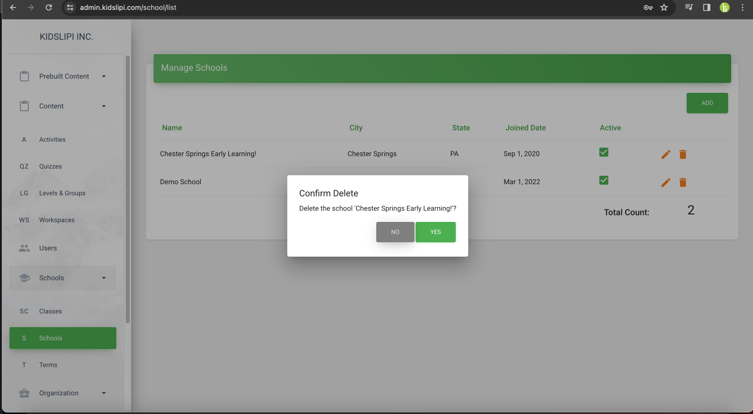 <figure><img src="https://2775373058-files.gitbook.io/~/files/v0/b/gitbook-x-prod.appspot.com/o/spaces%2Ff623a8ROiK5tAvdLpfx8%2Fuploads%2FLW7dS5pBvWbrc02zgodH%2FScreenshot%202024-01-24%20at%2012.58.23%20PM.png?alt=media&#x26;token=107c5274-6158-4b99-ac03-5f2980ad200f" alt=""><figcaption><p>Delete School Campus confirmation dialog. </p></figcaption></figure>