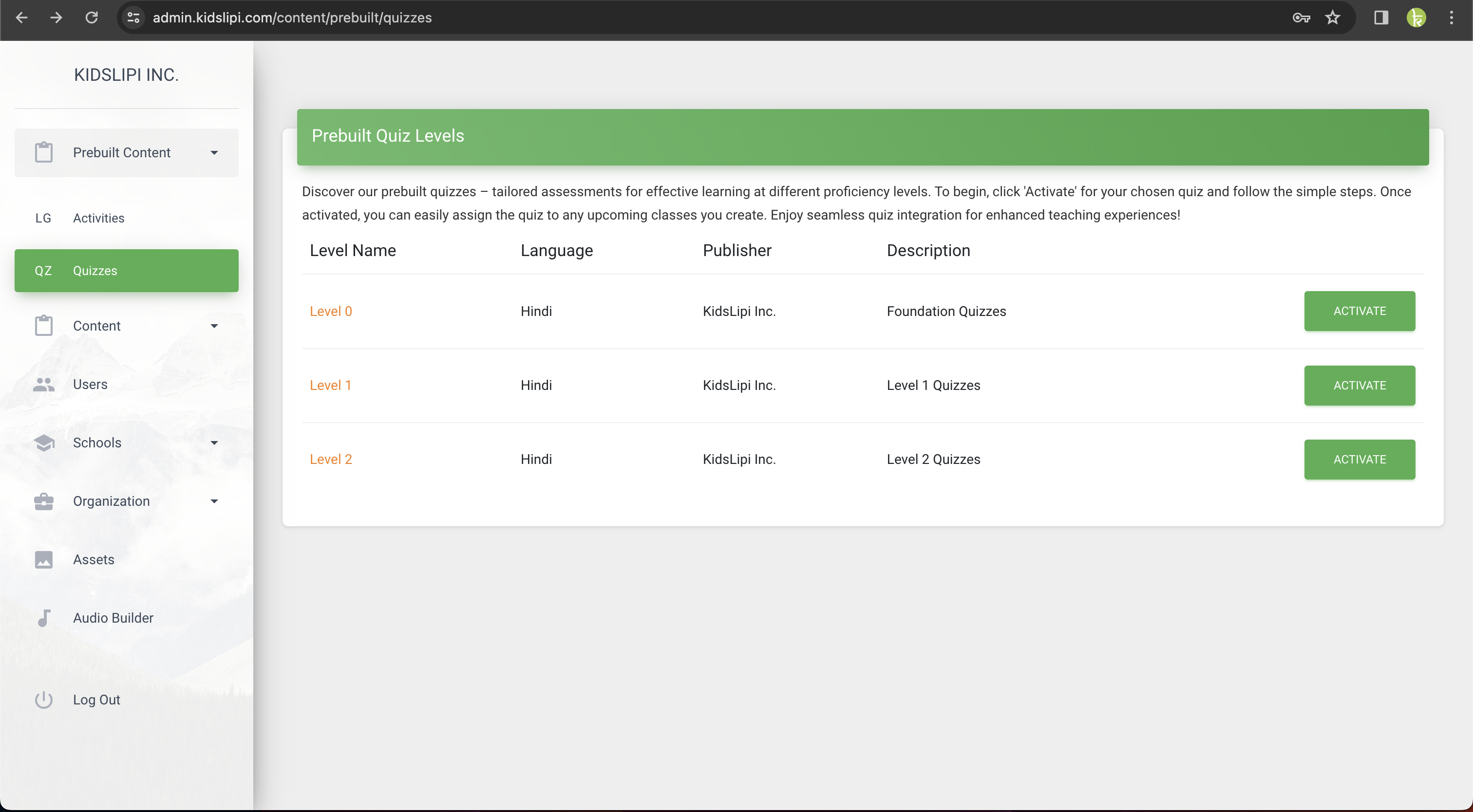 After exploring the prebuilt quizzes and selecting the most suitable level for your class, the next step is to activate this quiz level.