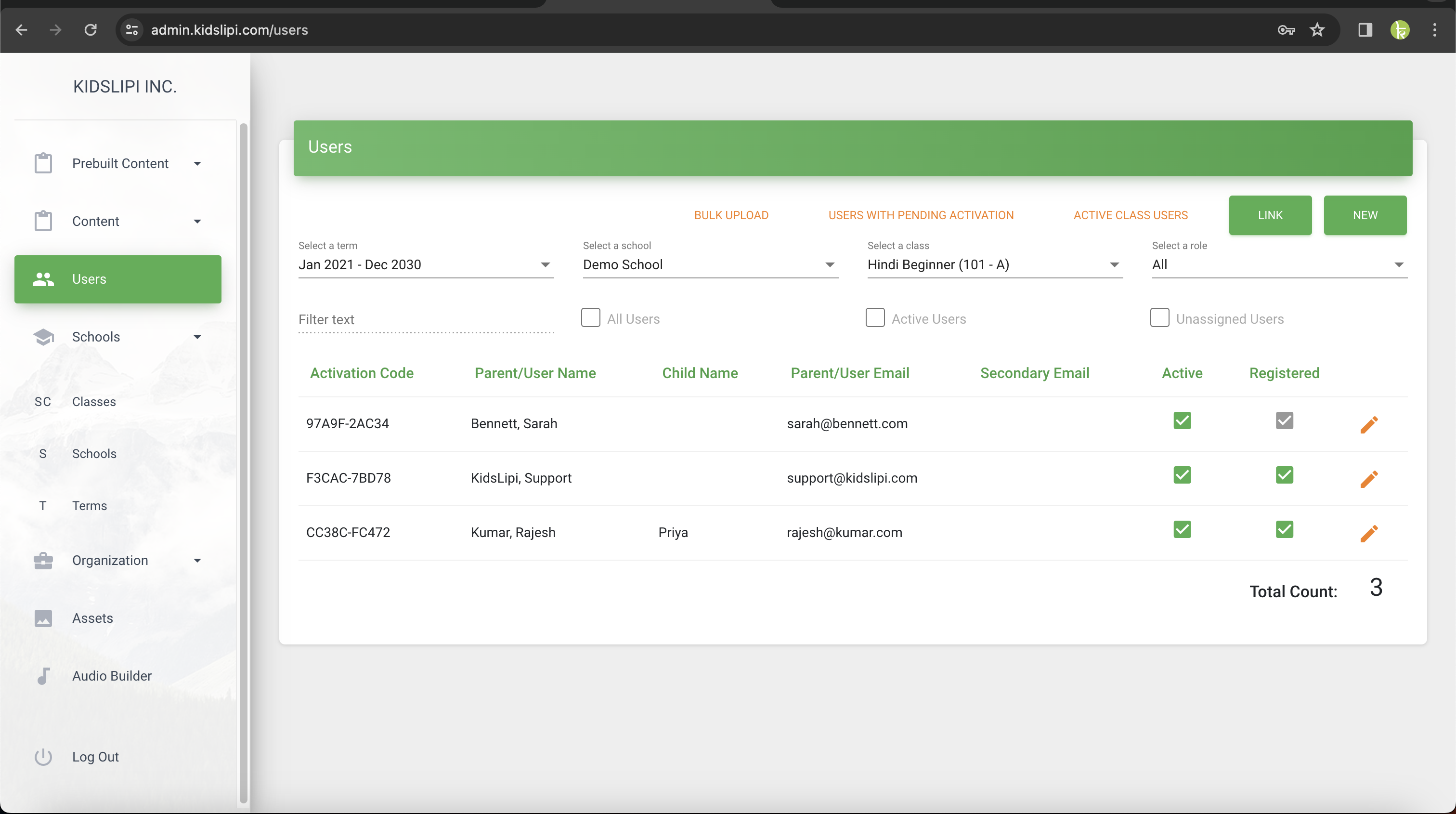 * **Bulk Upload:** Easily add multiple users to various classes and schools at once.